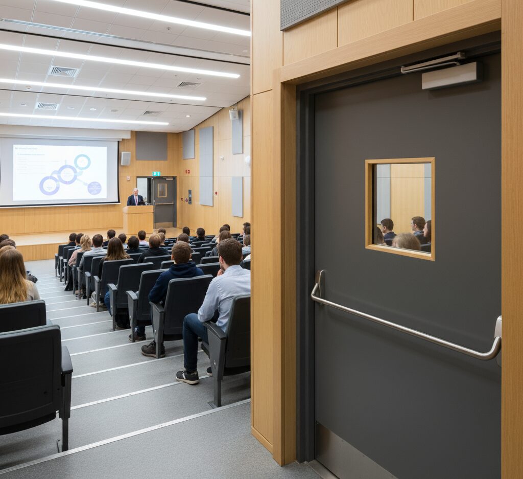 Proper perimeter sealing is critical: a mere 1/8″ clearance can drop a door’s effective rating from STC 52 down to STC 21!